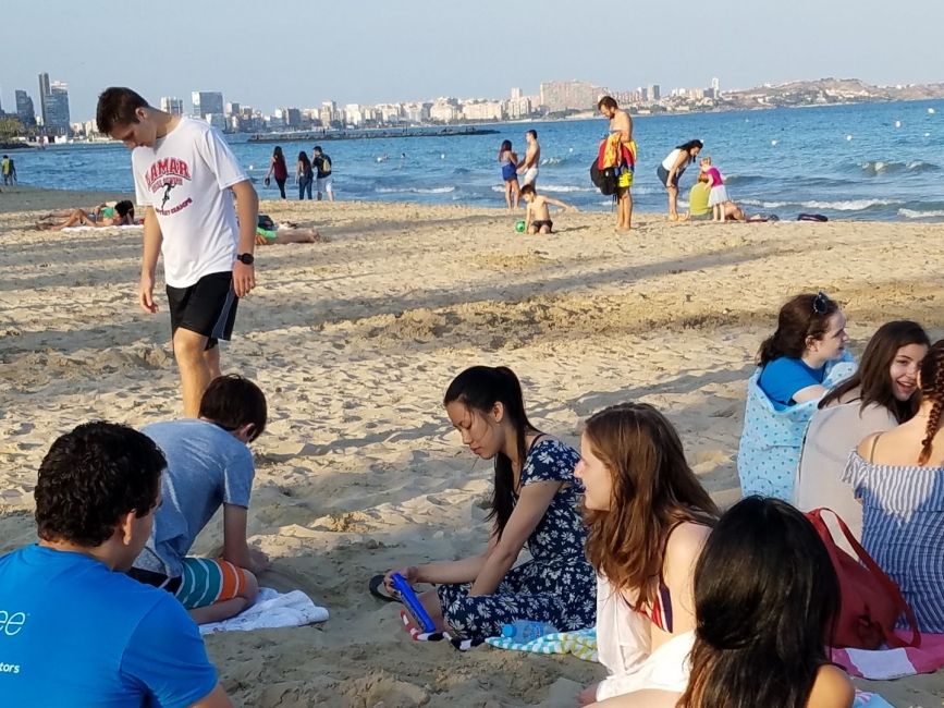 Our Alicante adventure started at the airport in Boston, MA where 24 students met to fly to Madrid with their Program Leaders Guillermo, Pablo, Carmen y Kelly. While they waited for the flight, the students played games and started getting to know each other. Once in Madrid, we took a shuttle bus to Atocha station to board the high-speed train AVE to Alicante. In Alicante we were greeted by Antonio, program coordinator, who brought us to the hotel. Later students experienced the Spanish cuisine with a delicious paella at a local restaurant. After lunch, students went on a double-decker bus tour of the city. The day ended at a beautiful beach in Alicante. Busy and fun day!