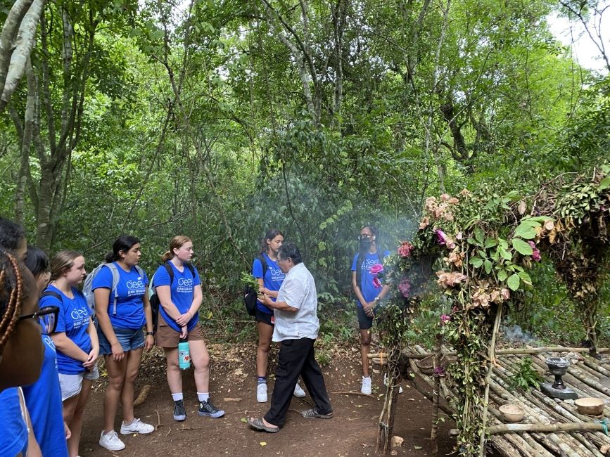 The third and final day of our journey was at yet another beautiful cenote, Cenote Xcajum. This one did not require you to be lowered down, however you did have to walk down about three flights of stairs to get to the water. It was open though so you could look up and see the blue sky and clouds above. It was a gorgeous, natural pool with vines hanging down the sides, wooden platforms to jump off of, and lifeguards making sure everyone stayed safe. We were able to spend about an hour swimming in the cenote, and then we made our way back up the stairs for another delicious buffet lunch. We finally returned to Merida in the afternoon so the students could get some much needed rest before starting their last week of the program.